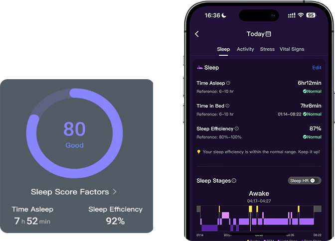 「深い眠り、浅い眠り、急速眼球運動、覚醒状態、睡眠動作」といった睡眠時の状態が瞬時にグラフ化