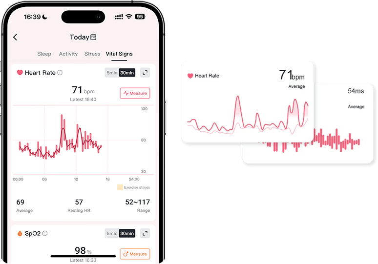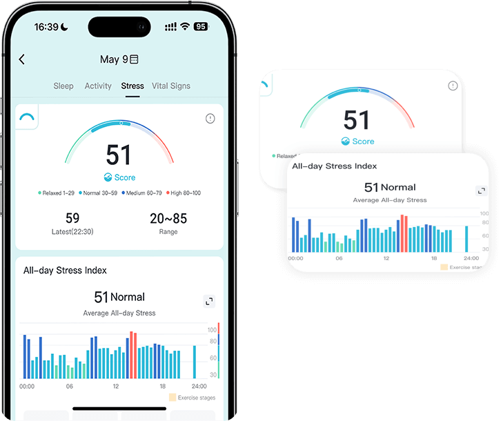 心拍数、心拍変動や活動データの傾向から「休憩のタイミング」や「緊張の傾向」をお知らせする